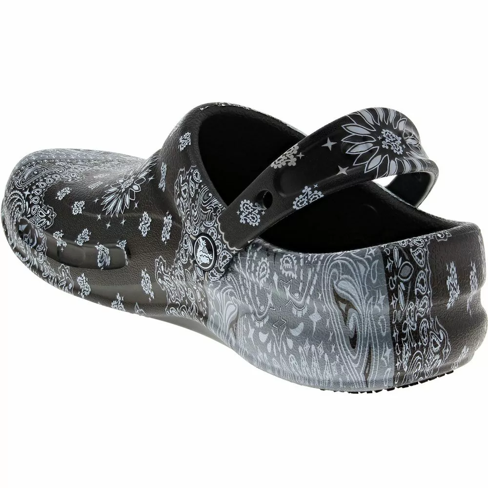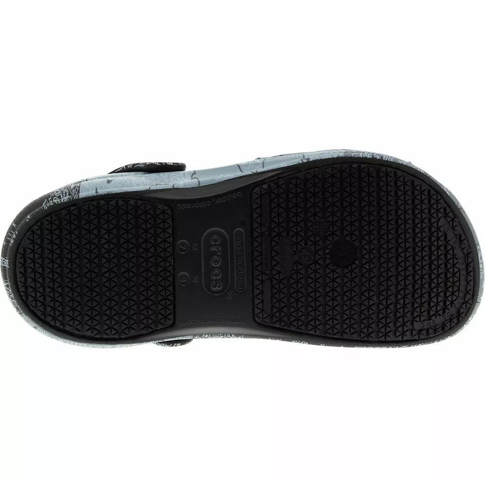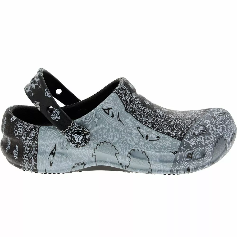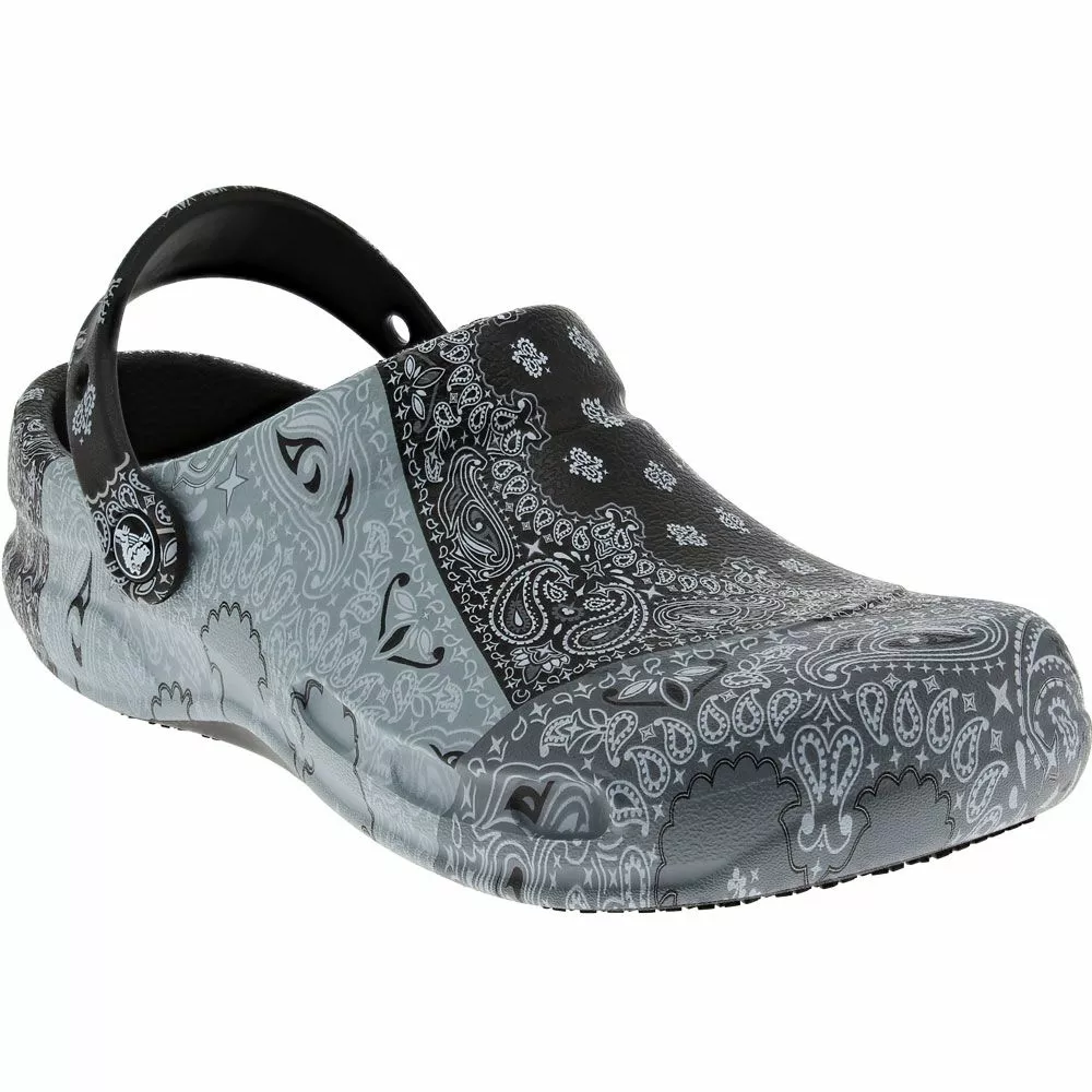 Crocs Bistro Graphic Mens Water Sandals. Crocs provide comfort and versatility with its mens water sandal. Bistro Graphic Water Sandals feature tons of creative designs to perfectly match your bold personality. These sandals are designed to be lightweight yet durable, perfect for hospitality, health care and food service workers to wear during those especially long shifts. The bottoms are slip-resistant and the toes are reinforced to provide extra protection.