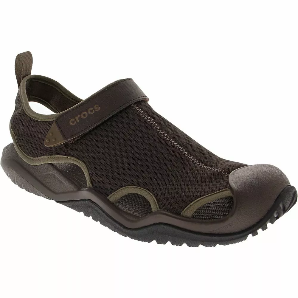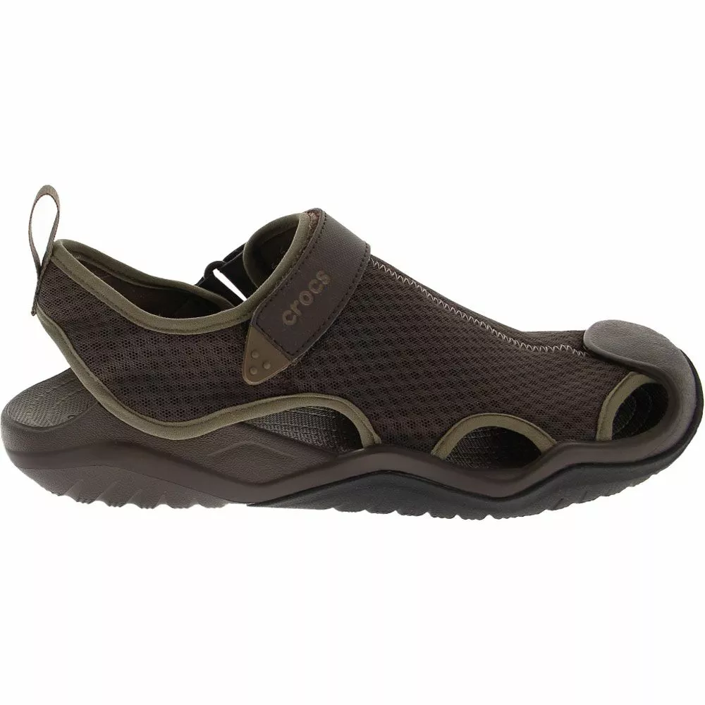 Crocs Swiftwater Mesh Deck Mens Water Sandals. Avoid slips and injuries and keep your footing both in and around water while wearing these newly-refreshed and streamlined mens water sandals from Crocs. The updated design of the Crocs Swiftwater Mesh Deck Water Sandals feature more cutaways and foot exposure so that water and elements quickly flow out and allow feet to dry faster. These sandals close with straps that are adjustable so your perfect fit is easily achievable.