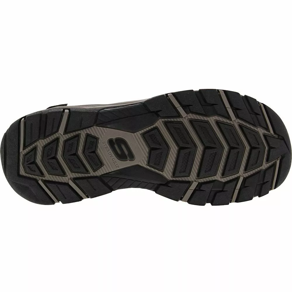 Head out on summer adventures with this pair of Skechers mens sandals on your feet. Built to meet the stresses of the nearest trail, this shoe can handle walking across moderate to easy paths while keeping your feet supported on a cushioned insole and shock-absorbing midsole. The hook and loop closure gives you the ability to optimally fit the shoe onto your foot.